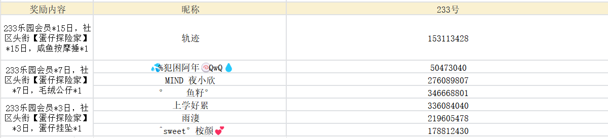 三等奖(11名):233乐园会员*3日,社区头衔【蛋仔探险家】*3日,蛋仔挂坠*1