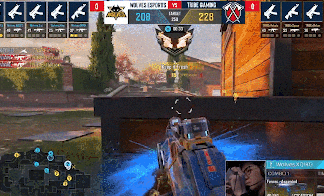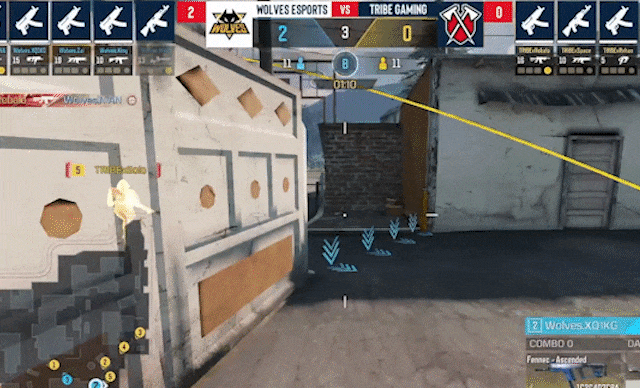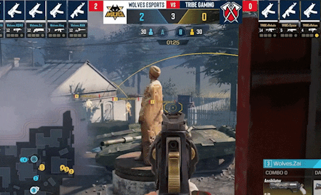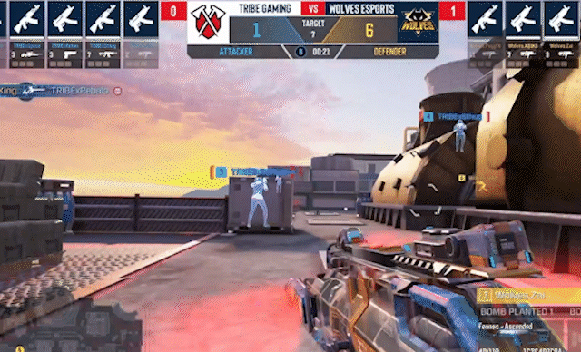 重庆狼队.凤年配合队友,夹击B包,小拳拳背后出击,带走架枪的TRIBE.Space,成功拿下赛点局。