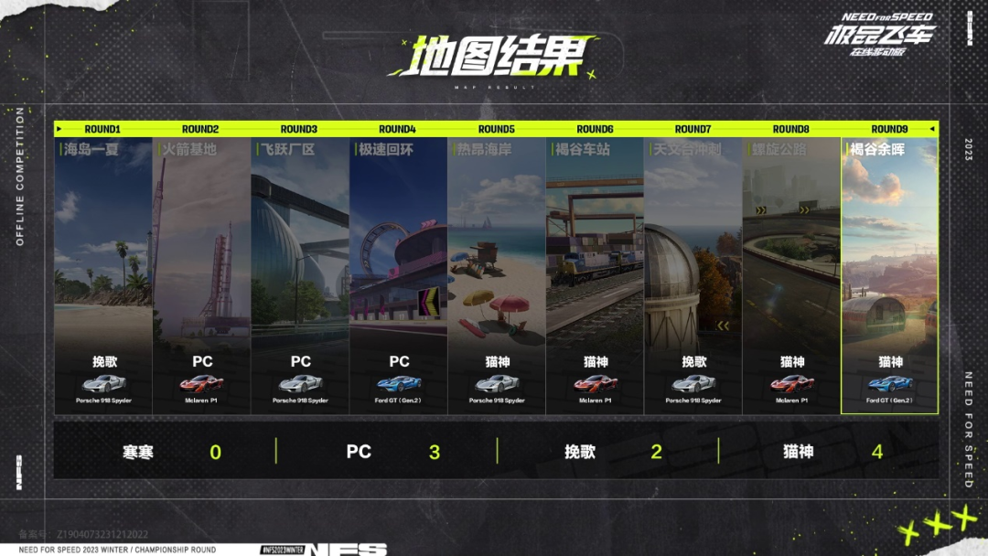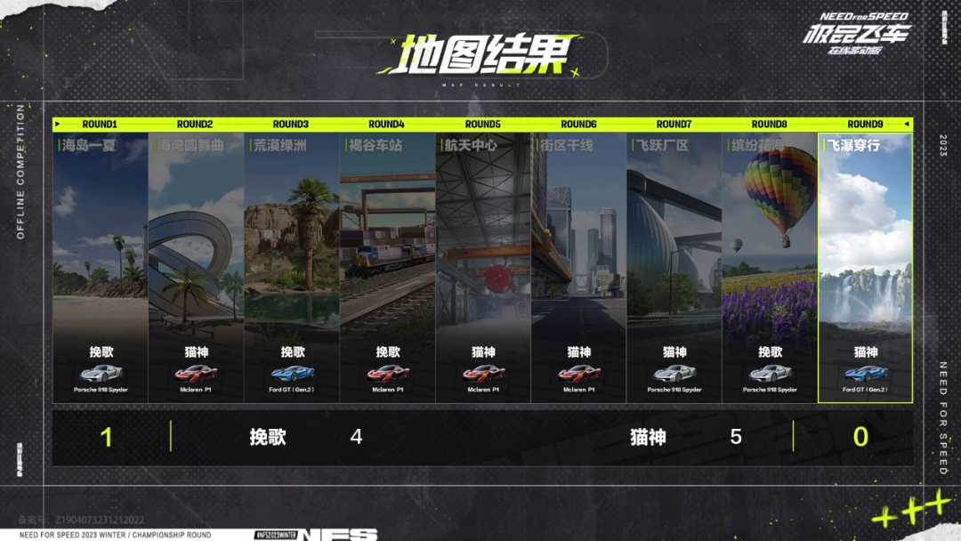 开局双方各得1分,随后的比赛挽歌斗意高燃,两连冲线打破了拉锯战的僵局,但接下来猫神立刻凭借两张自选图扭转了劣势。第七局地图飞跃厂区,猫神在落后的情况下内线超车,率先来到局点。接下来挽歌顶住压力再次将比分扳平,比赛进入白热化,决胜局开启,地图飞瀑穿行,猫神在落后的情况下抓住对手拖漂的机会完成反超,随后他通过极限出弯夺回主动权,在大心脏局稳住了阵脚,以5:4的比分赢下第二轮。