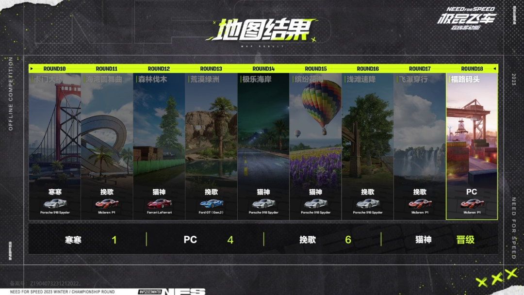 此时场上只剩下挽歌、PC和寒寒三名选手,挽歌积4分,PC积3分,寒寒积1分。第十六局地图浅滩速降,挽歌逆风翻盘,在开局落后的情况下完成反超,最终大距离领先冲线。第十七局地图飞瀑穿行,挽歌经过和寒寒的惊险缠斗反败为胜,来到赛点。比赛最终定格在福路码头这张地图,挽歌在前期失误的情况下,凭借极限操作逐渐追回劣势,再次上演逆转,成为第二名晋级决赛的选手。