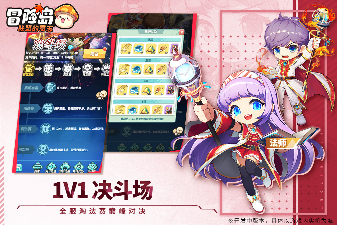 【决斗场】是面向服务器全体冒险家的1v1PK赛事,也是游戏中最为刺激的PVP赛事之一。报名参赛的冒险家需要在短短数小时内不断与不同的对手进行1v1PK,胜则晋级负则淘汰,最终胜者将登上冠军宝座。