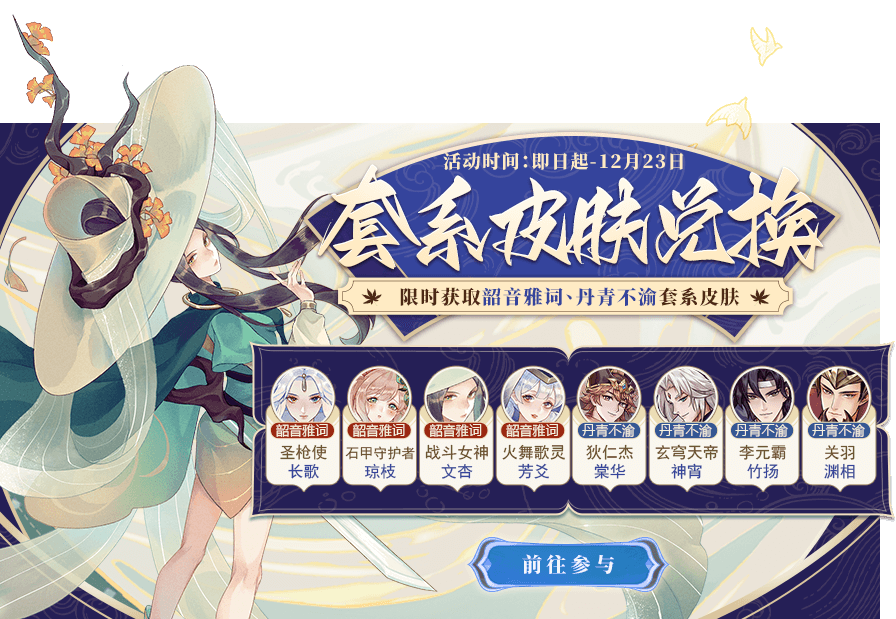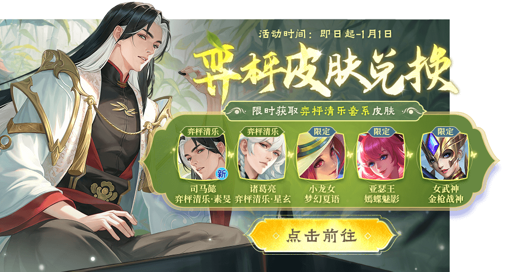 通过每日登录等方式获取弈枰兑换币,累计弈枰兑换币可以限时获取弈枰清乐套系全新皮肤司马懿-弈枰清乐·素旻、诸葛亮-弈枰清乐·星玄、还有亚瑟王-嫣蝶魅影,小龙女-梦幻夏语、女武神-金枪战神等限定皮肤等你来拿哦!