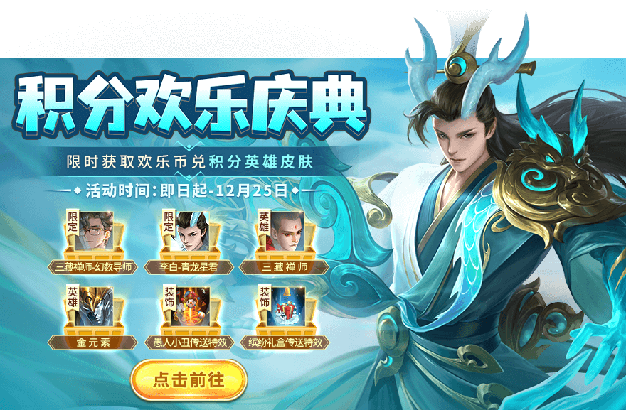 活动期间参与积分欢乐庆典,通过每日登录等方式限时获取欢乐币即可兑换夏侯惇-北京天阙、李白-御点墨客、混沌之源、三藏禅师、火元素、金元素等积分英雄皮肤奖励!
