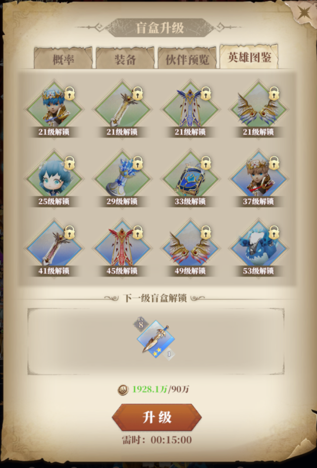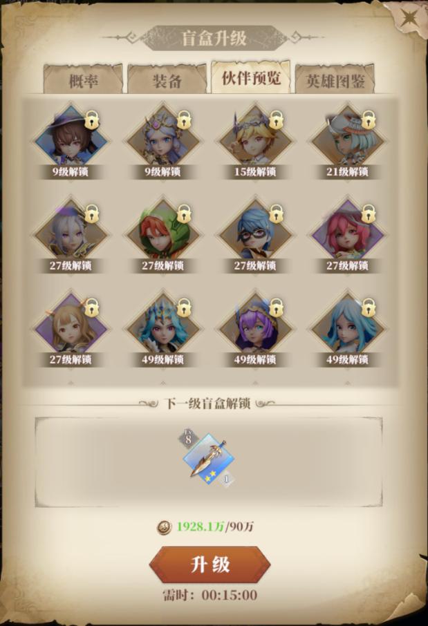 奇妙盲盒是提提升战力的基础,而另一个十分重要的就是盲盒的等级,盲盒等级决定了产出装备的等级上限,并且随着盲盒等级的提升可以解锁更多的伙伴和英雄装束。