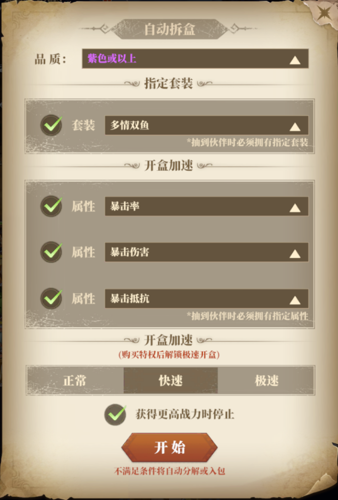 通过筛选盲盒产出的套装属性以及开盒速度等内容,可以自动进行拆盲盒的工作,大大降低了冒险者的操作负担。
