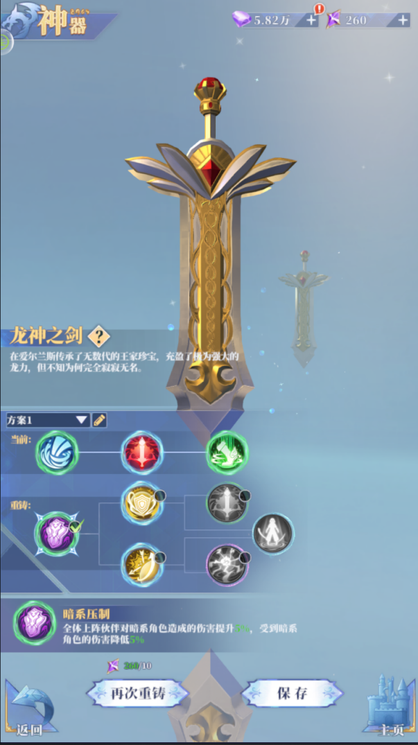 每位英雄都有专属神器可以给伙伴们带来强化收益,一共三层,每层带来的强化效果都不一样,可以通过重铸来更改神器技能带来的强化收益。