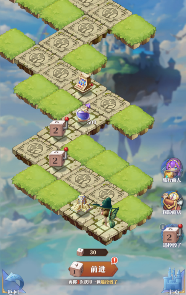 在空岛探险中冒险者可以通过消耗一颗普通骰子进行前进,根据点数前进相应的步数,根据前进后的所处位置触发特定事件或获得对应道具。
