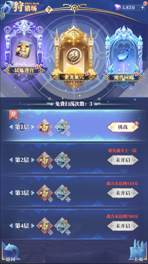 当战力达到所需要求后可以挑战更高层数的关卡,挑战成功后可开启扫荡。每天有三次免费扫荡的机会,冒险家们一定不要错过哟。