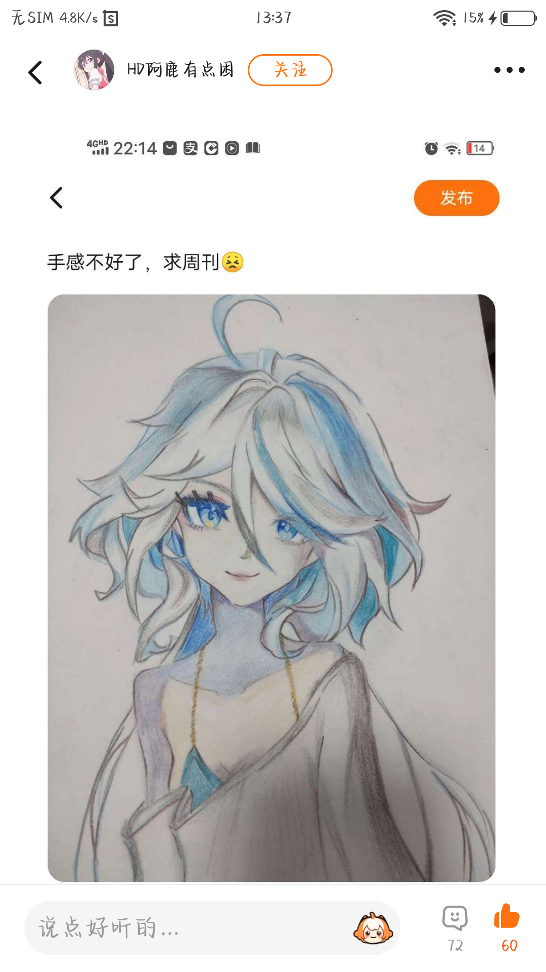 阿鹿的绘画手艺还是那么好哇!这次的画作居然是是原神里的芙卡洛斯(ಡωಡ)真的好稀饭(喜欢)彩铅也能画出那么好的效果,阿七属实羡慕这画技(☍﹏⁰)好妩媚的芙芙!喜欢芙芙的友子快冲冲冲!