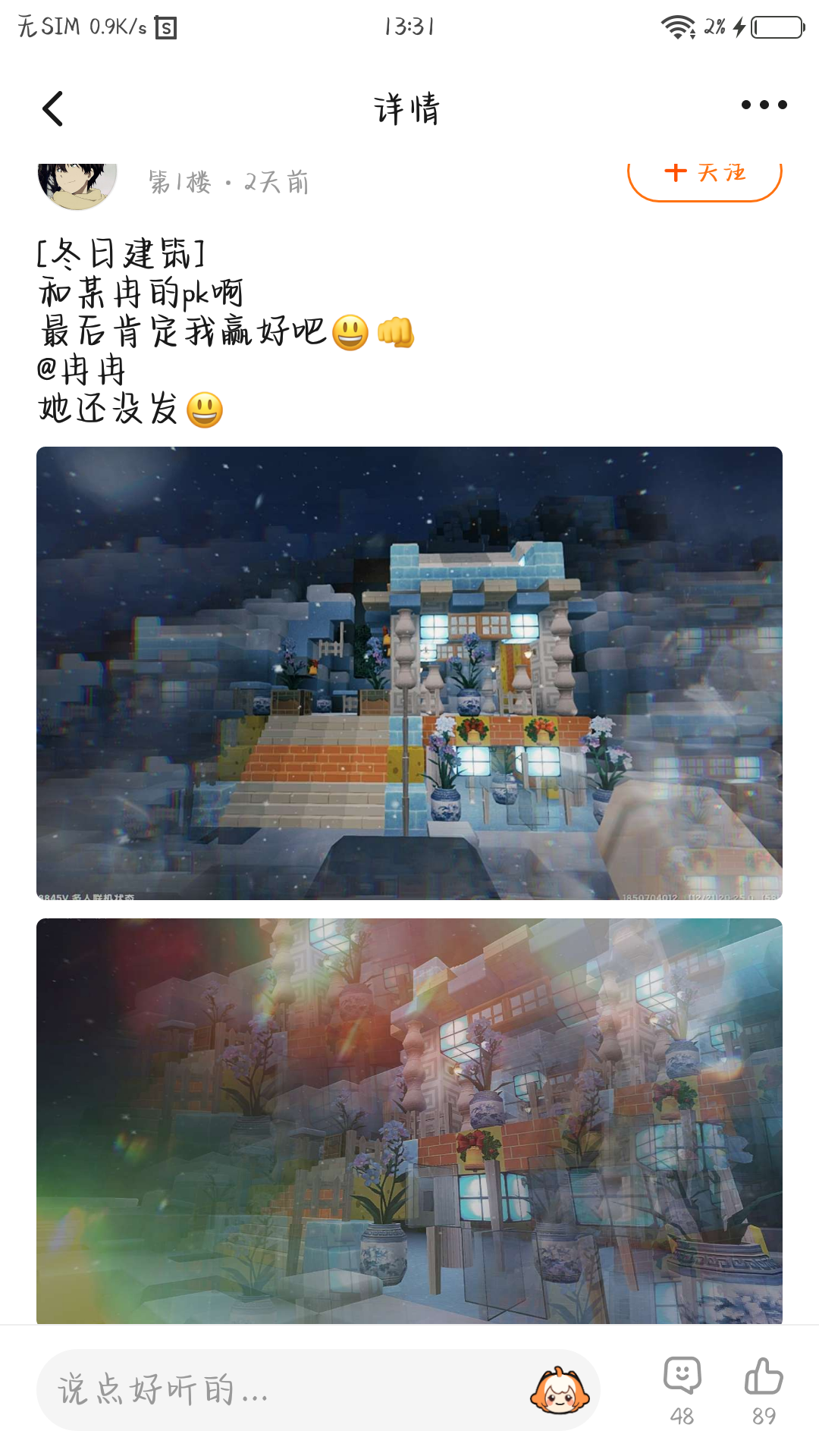 看样子作者大大对于建筑pk已经胜券在握了呢!冬日主题的建筑好米好米(美),独特的建造风格和新颖的装饰,第二张建筑图片展示和滤镜的结合阿七真的好稀饭(喜欢)!!!