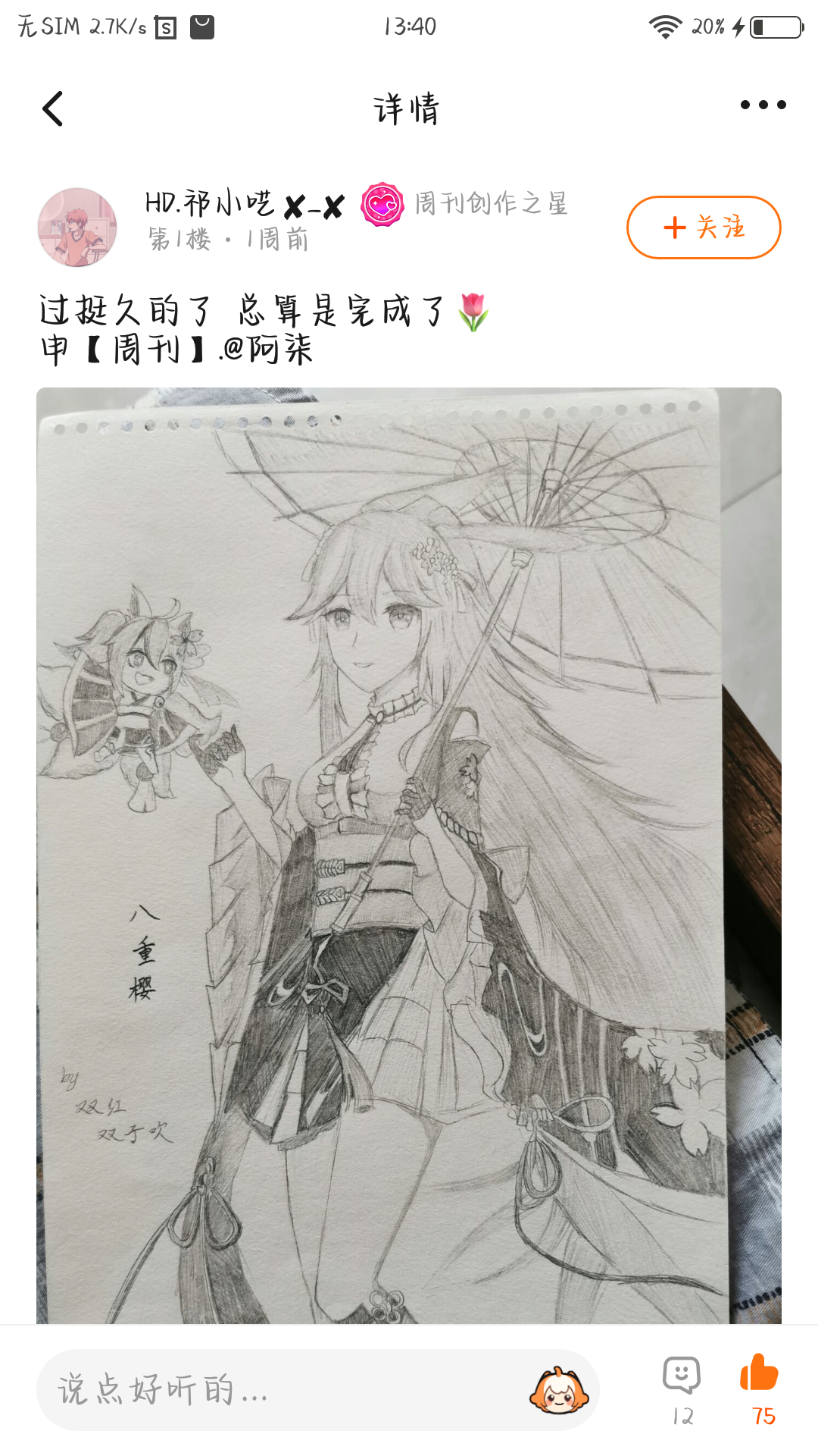 大大的画技也是很不错捏!作者大大画的八重樱尊嘟(真的)很细节,衣服上该有的图案装饰都画得很到位捏!好爱好爱!真的好会画꒦ິ^꒦ິ