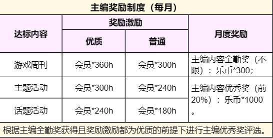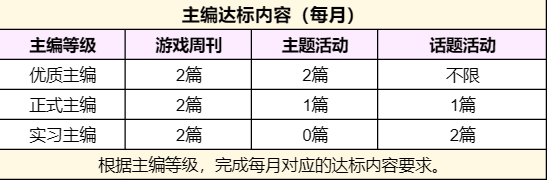 1、每个季度进行一次主编评分活动,通过问卷方式,在对应游戏圈了解其他玩家对主编的满意度,主编满意度低于平均值,将降职一级。实习主编降职将取消主编资格。