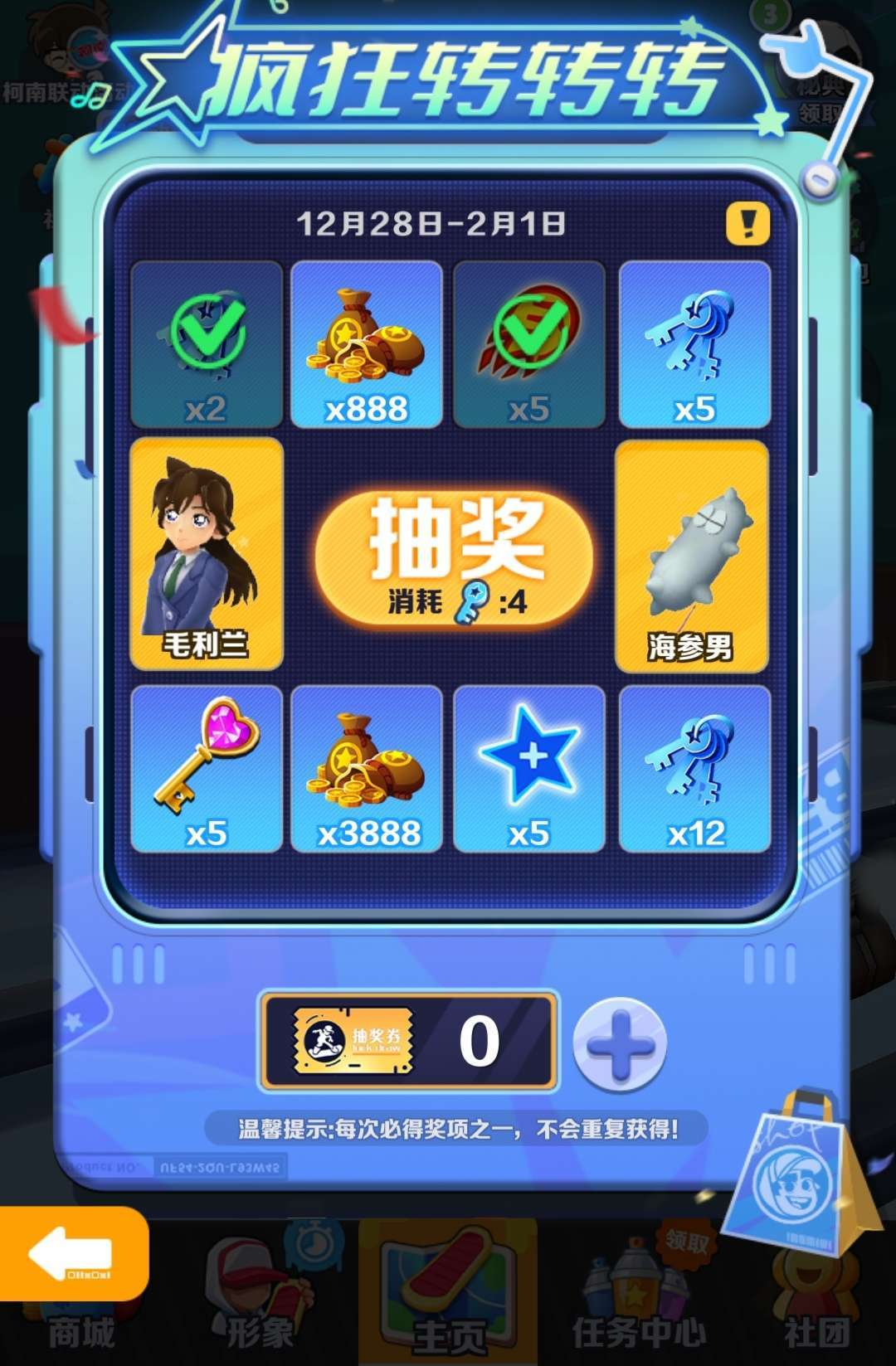 官方返厂目前与名侦探柯南联动相关皮肤可以供错过玩家抽取,比商家新的疯狂转转转大奖为毛利兰与海参男