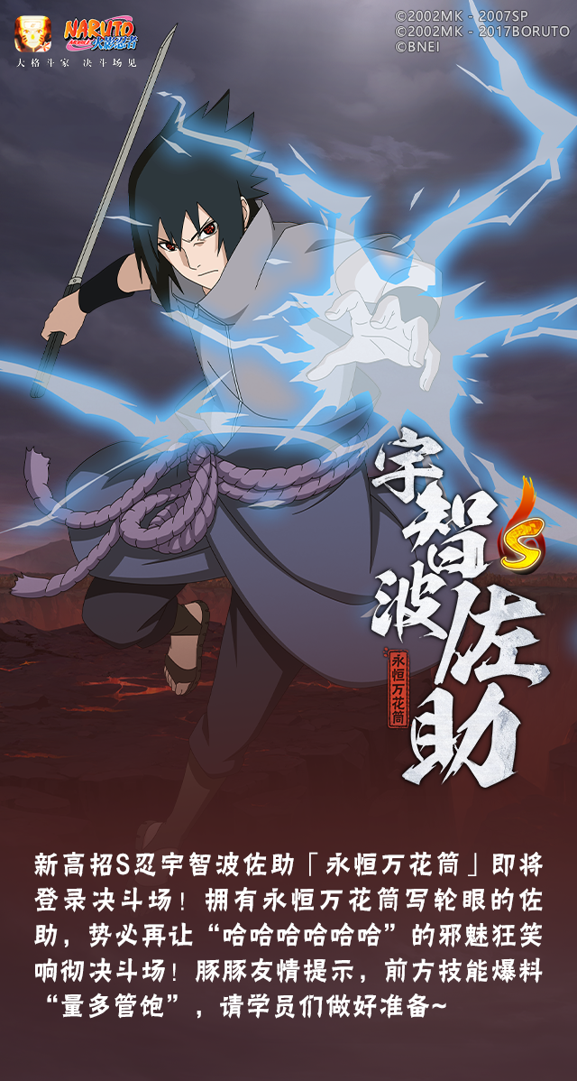 佐助需要蓄力才能释放强化后的一技能,蓄力期间佐助会吸附周围的目标,并且开启带有格挡效果的须佐能乎保护自己,蓄满后可释放一道强力黑炎;也可以选择提前结束蓄力释放一道黑炎。