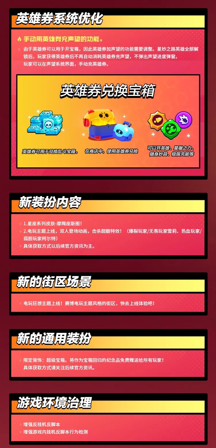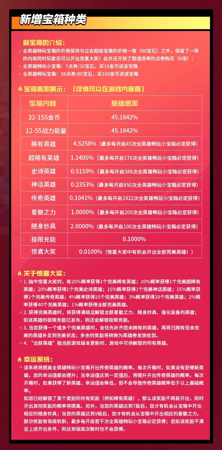 此外新添加了宝箱种类:全英雄畅玩宝箱,新宝箱可以支持用户开出各稀有度的英雄,星徽之力,随身妙具,金币,战力能量,极限充能之外,用户还可以开出惊喜大奖!惊喜大奖包括满级英雄,以及全英雄等大奖!(具体概率信息可在版本更新之后,点击商店宝箱,进行查看)
