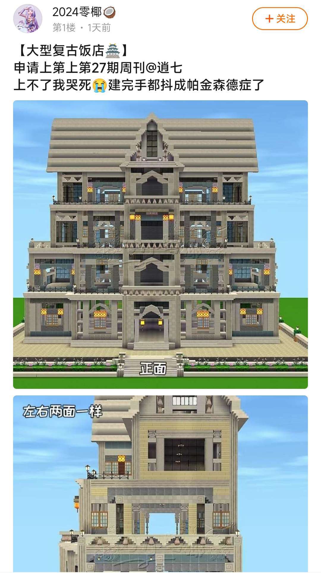 又是一款大型复古建筑!装饰细节很到位呢!期待大大还会出更多优质建筑~