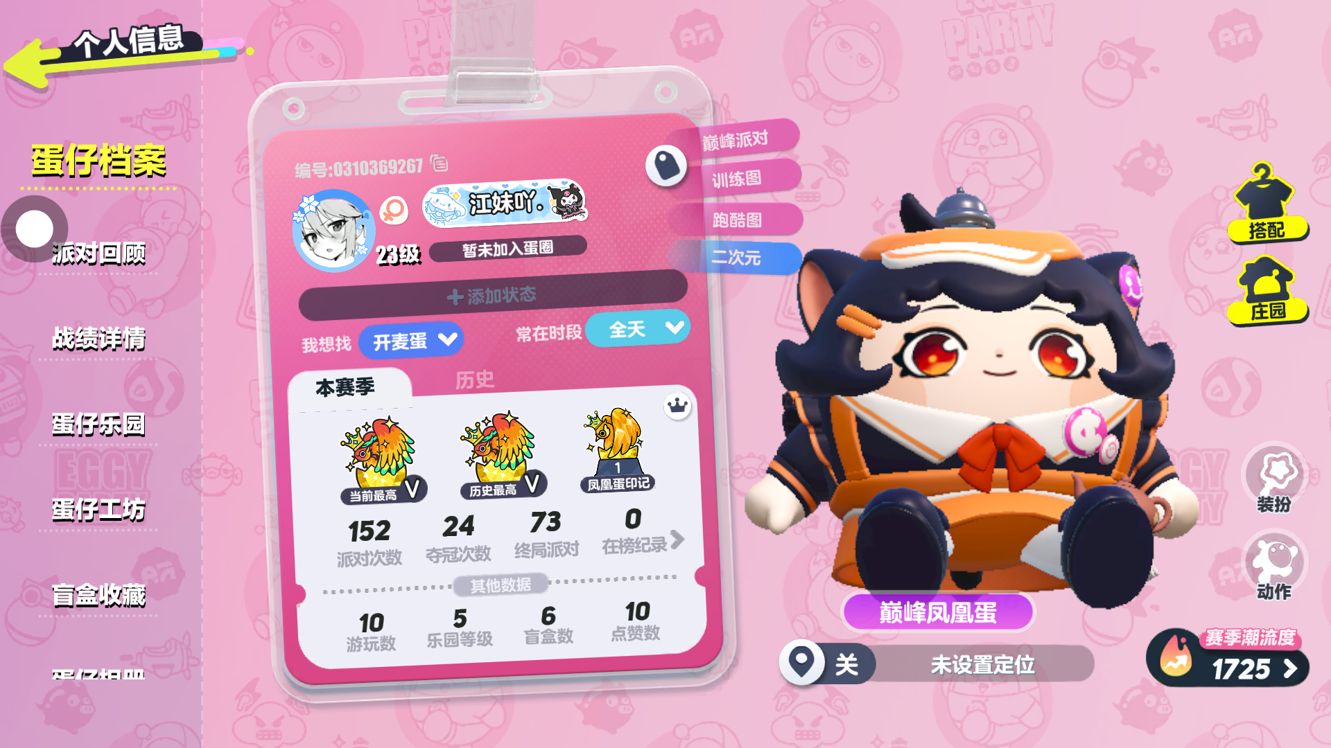 ^刚玩蛋仔派对 ^就挑战了一星期上凤凰^ 最后一天11:02成功🤡 蛋仔:[江妹吖.]^想继续 ^上段位. 大佬求带 .你再看看这派对次数. 再看看夺冠次数 ^再看看终局派对^ 他们竟然分手了^😭