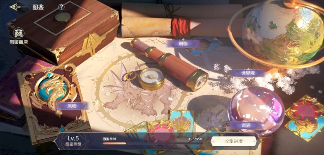 图鉴主要分为六个部分,最中间展示也是最关键的是具体的图鉴大类:「风物」「剧情」「世界观」「奇遇」