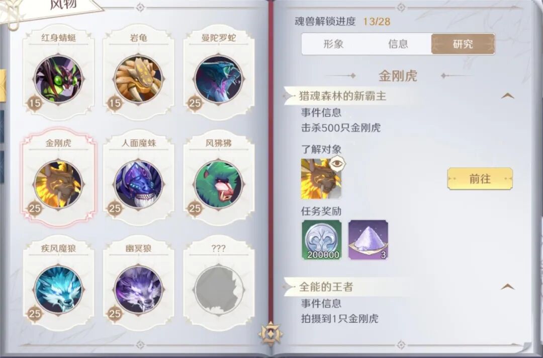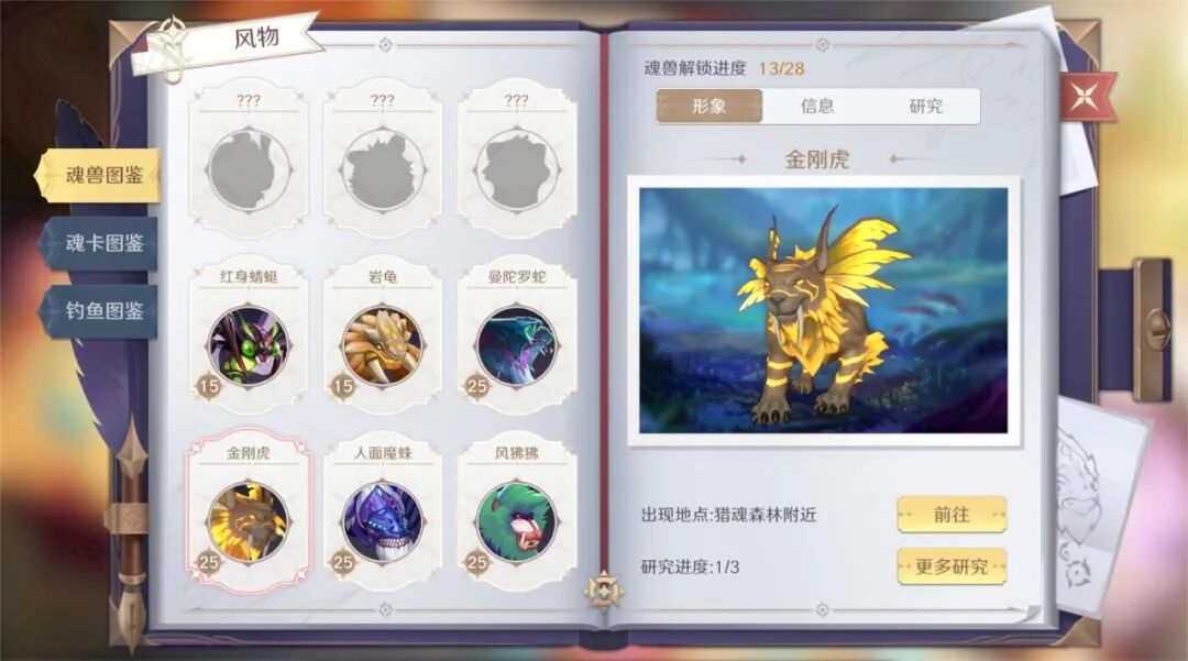 在【魂兽图鉴】页面可以看到自己所遇到过的各式魂兽,可以从中了解到它们的形象外观、栖息地和生态信息、以及自己对他们的研究进度。还可以通过完成特定的研究任务,来解锁与获得不菲的资源奖励哦!