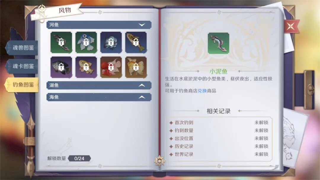 最后一个则是钓鱼佬狂喜的钓鱼图鉴,在其中可以看到各式的鱼获,可以详细了解到它们的功能,还能知道自己的第一次钓鱼生涯“首杀时间”和各式记录哟。不过图鉴内似乎没有直接记录这些鱼的出没位置,看来无论是现实还是斗罗大陆里面,钓鱼点都是只有资深钓鱼佬才知道呀。