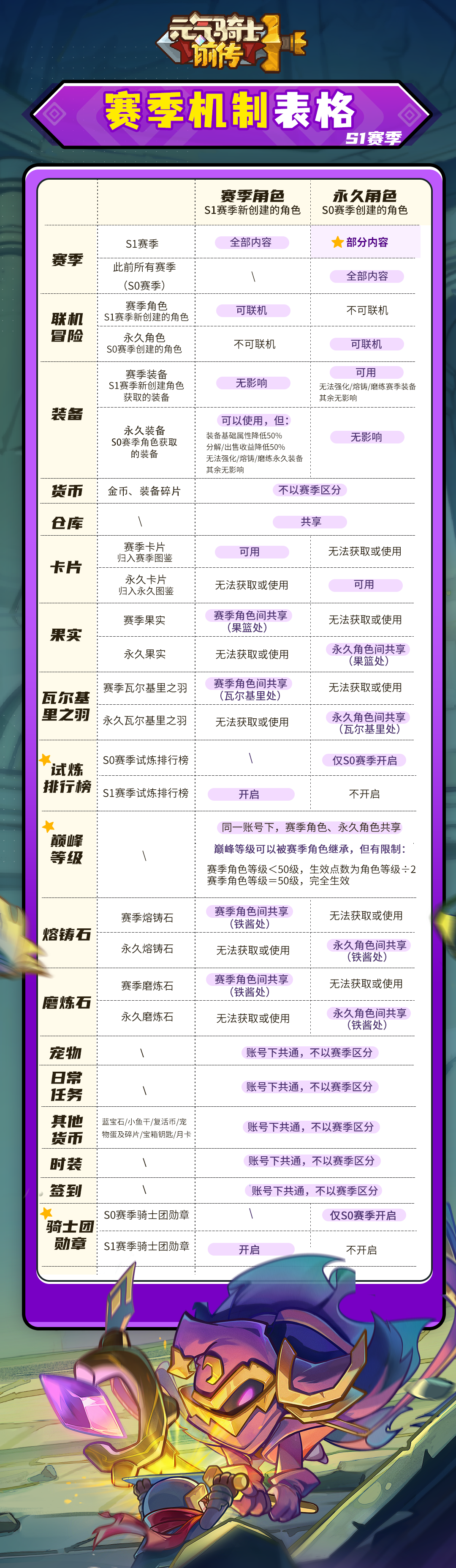 关于赛季角色和永久角色有哪些不同,还可以看看村长更新过后的赛季机制表格噢↓