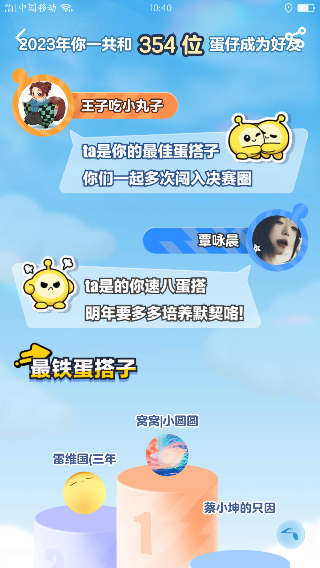虽然我是一个零氪玩家,但我不比其他玩家差,我有好多蛋友陪着我,从S7赛季到现在的S14赛季,我在岛上交了好多朋友,和他们一起玩耍,打巅峰,我还攒了好多好多彩虹币去抽我喜欢的肓盒,攒了好多纤维去买染色瓶升级盲盒,而且这还是一款益智游戏,还可以让你从中得到成长,意识到什么是好朋友,接下来我还会一直陪伴着蛋仔!☺😊
