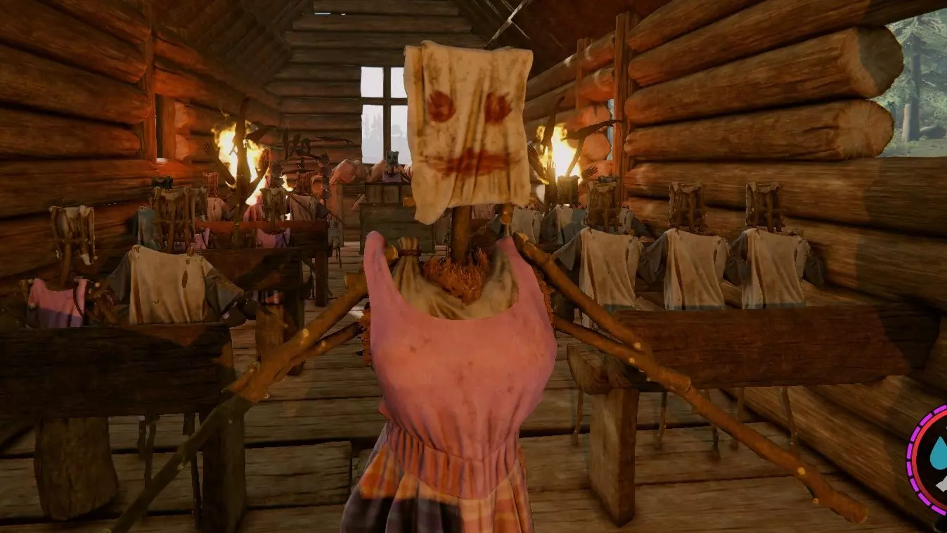这是恐怖生存游戏《森林》的游玩内容,玩家在森林木屋中遭遇野人闯入,玩家用弓箭反击闯入的野人,过程中还能看到游戏内的资源收集提示。