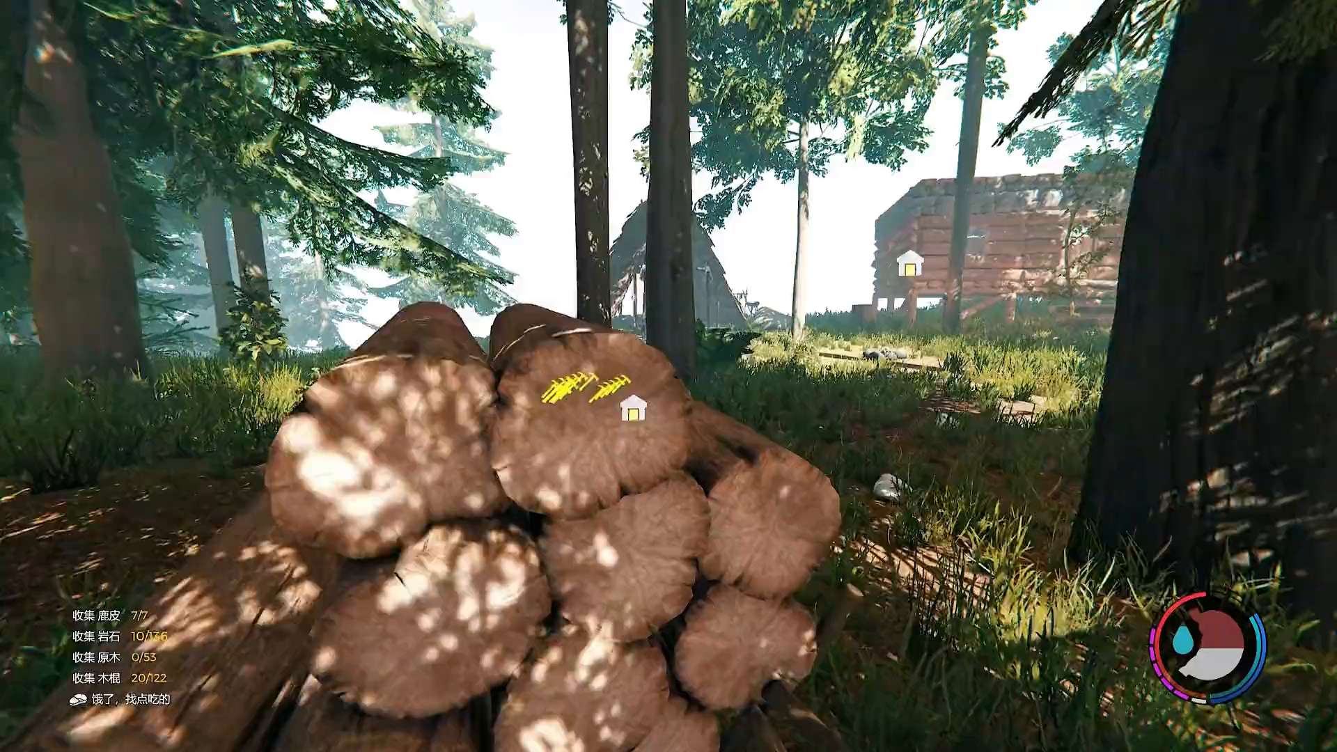 这是游戏《森林》的圈养玩法展示,玩家在森林场景里,将变异野人吸引进木栅栏围成的区域,然后关闭栅栏门完成圈养,呈现了游戏里的趣味生存操作。