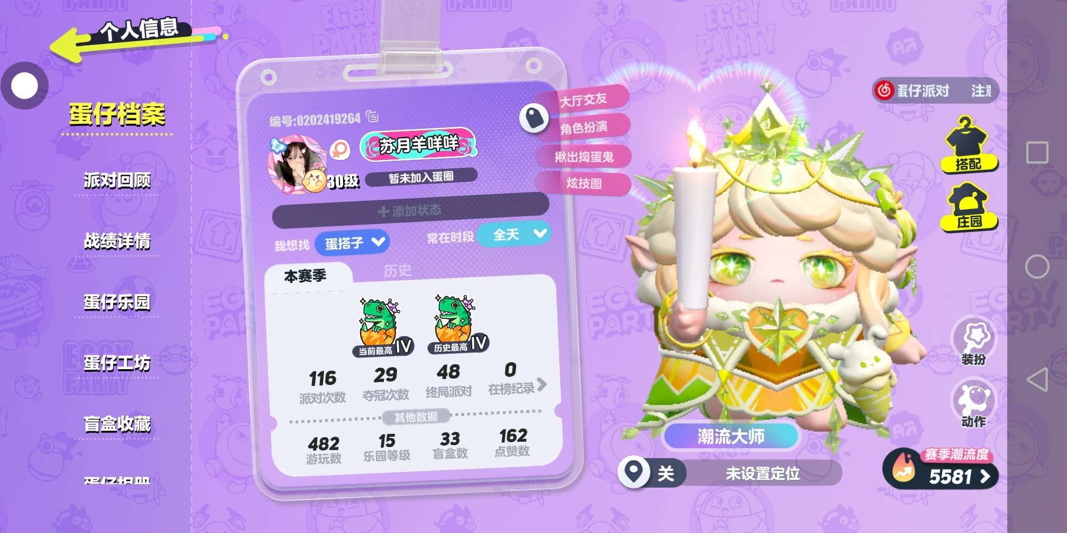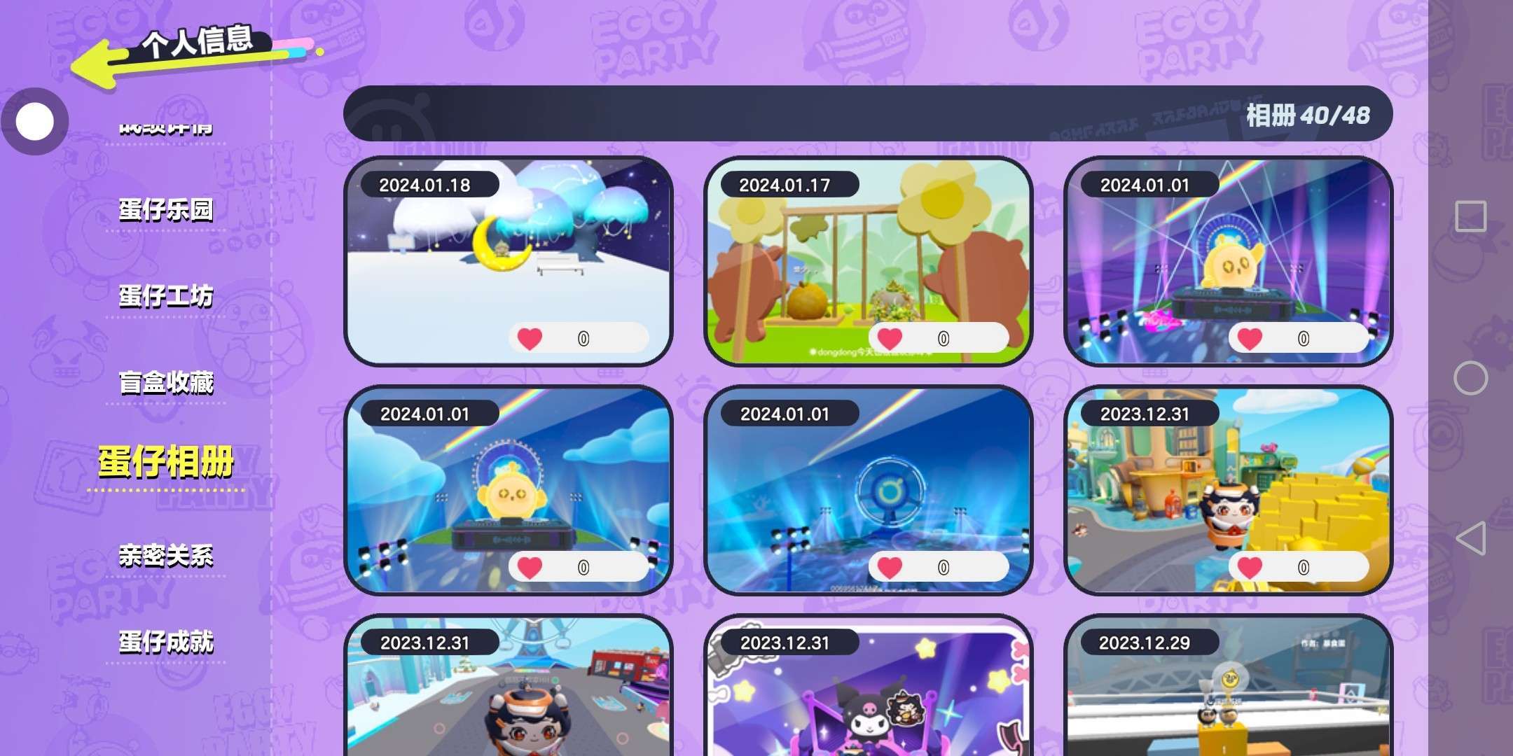 2023年六月份是我入蛋仔的第一天,当时不知道潮流纤维是干什么的,后来才知道他可以买紫皮和一些蓝皮,当时看的那些主播个个都是凤凰蛋,自己也梦想成为一个凤凰蛋,那时候什么都不知道,名字也是冈易匹配的,真的尬的要死,我第一个紫皮是心心念念很久的仔仔熊,后来慢慢的学会了打巅峰,玩乐园,认识了很多很多小伙伴,虽然有时候玩几天就会忘了🌚🌚但是每次他们和我玩,我都玩很开心⊙▽⊙,最后,祝蛋仔岛越来越好!玩家越来越多,福利越来越棒😋😋