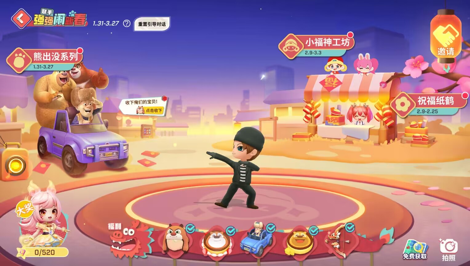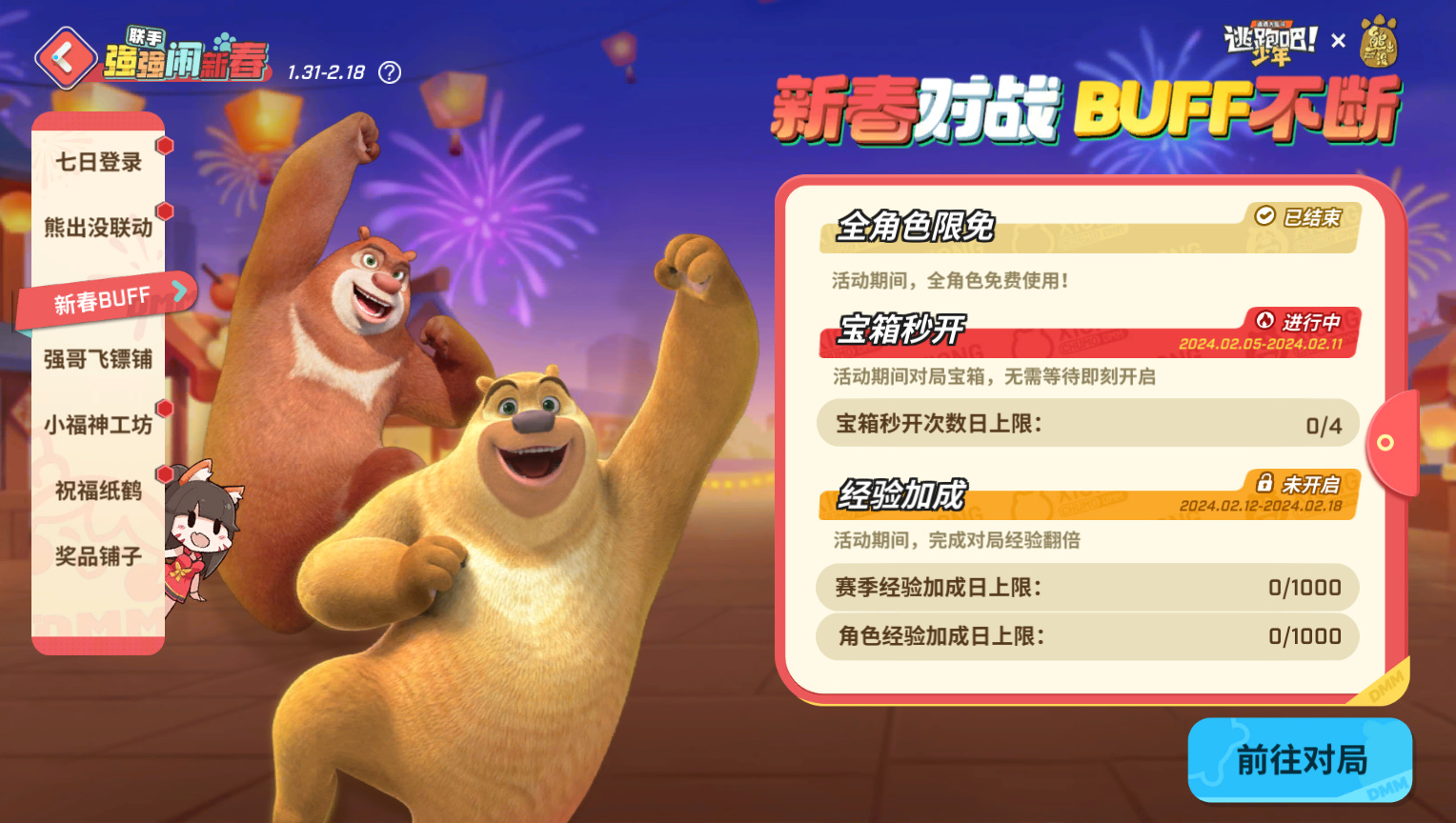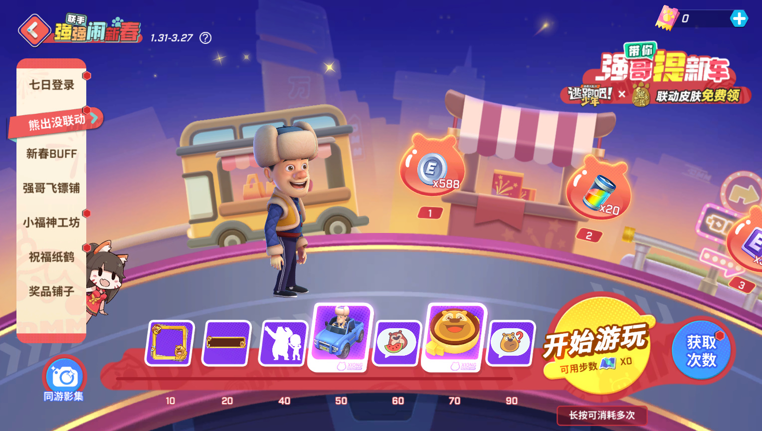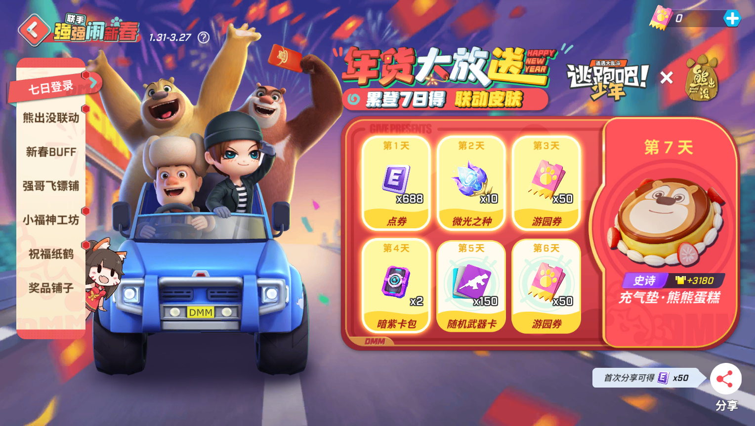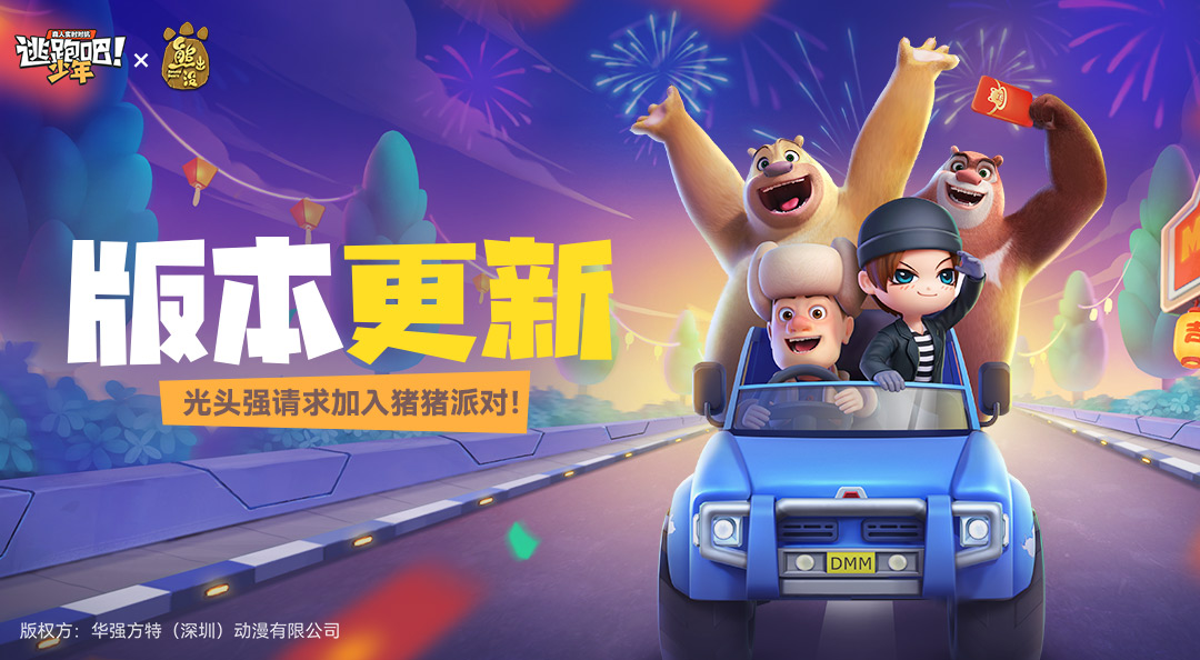 1月31日至3月27日,完成任务领取步数,点击【开始游玩】就可以和强哥开启新春提车之旅,一起逛遍DMM咯!【皮卡·向快乐出发】光头强汽车皮肤、【充气垫·熊熊布丁[熊二]】皮肤、联动动作&气泡&头像框&气泡框等好礼免费领!