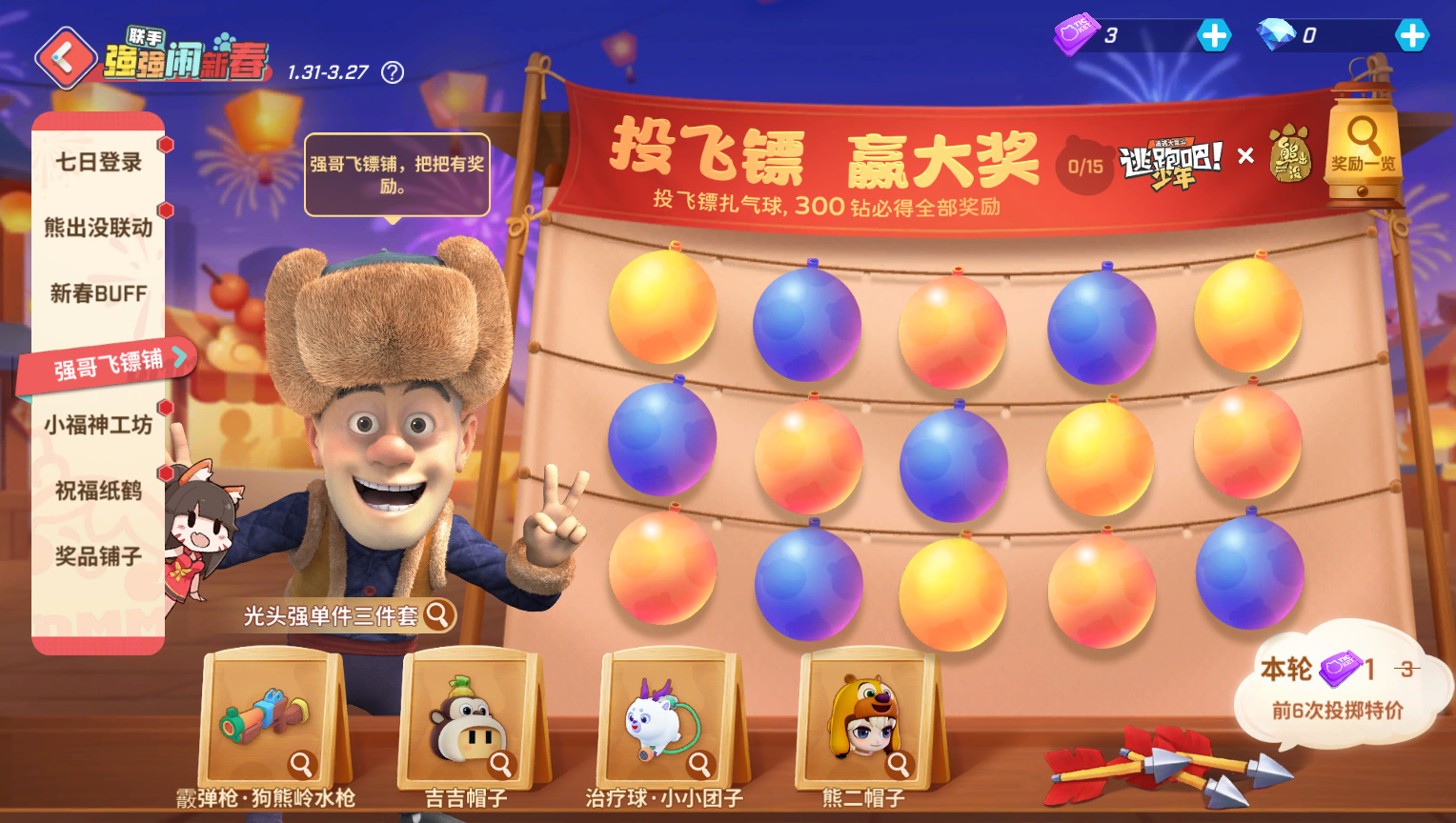 1月31日至3月27日,扎气球、赢大奖~前三次,免费扎!【霰弹枪·狗熊岭水枪】、【治疗球·小小团子】、【魔术师·吉吉帽子】、【灵膳子·熊二帽子】还有光头强服装、联动气泡&涂鸦&动作累计15种好礼!最高300钻就可以全部领回家咯~