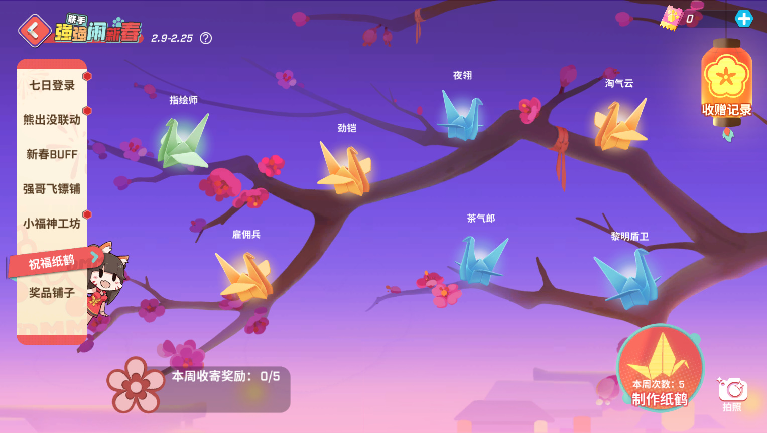 少年新收到的纸鹤都会停在树上等你开启!除了好友寄福,少年每日登录将会收到来自DMM伙伴的专属祝福纸鹤呦~嘿嘿,新的一年,小学妹把想和你说的话也写在纸鹤中啦!