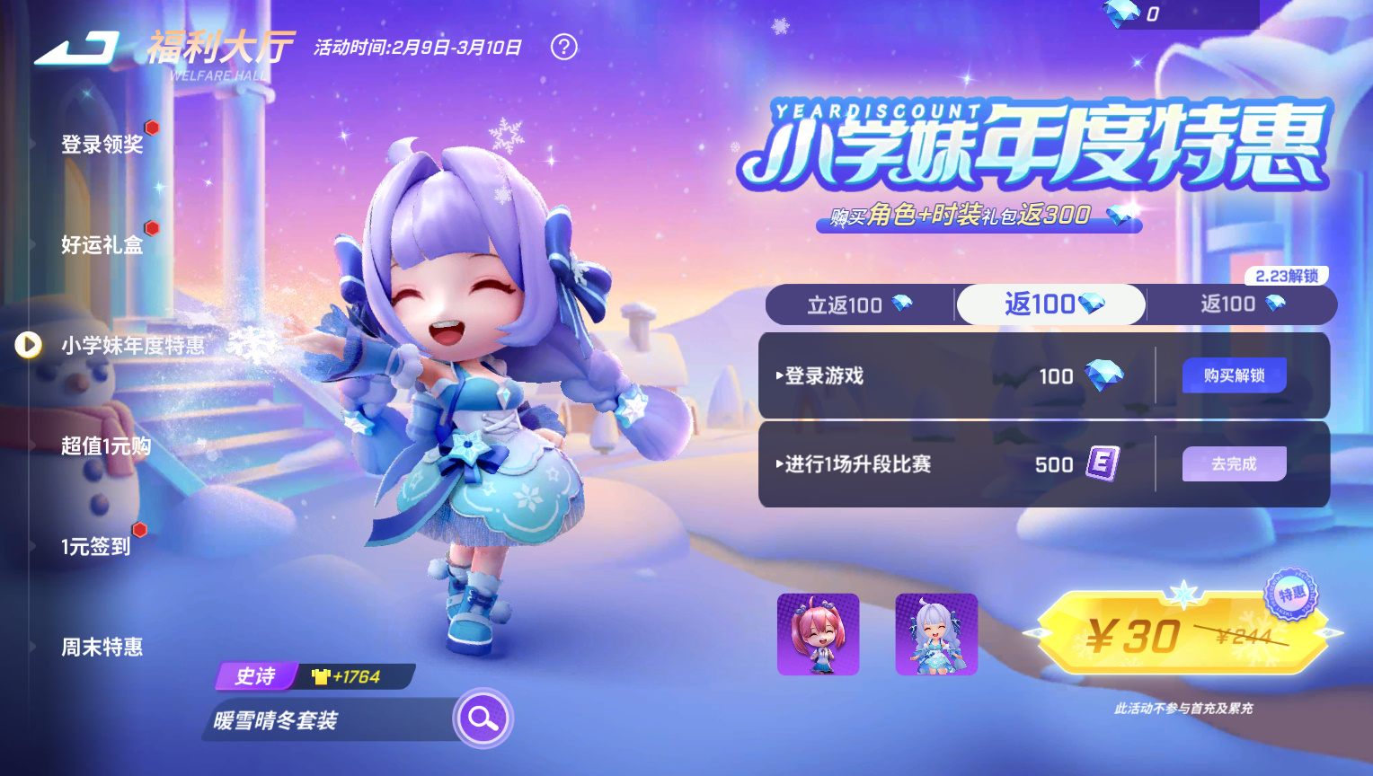 2月9日至3月10日,小学妹角色价格史低!购买礼包全额返钻!未拥有小学妹的少年,30元即可购入角色及时装【小学妹·暖雪晴冬套装】并全额返还300钻;已拥有小学妹角色的少年,也可以6元购时装并得到全额返钻!
