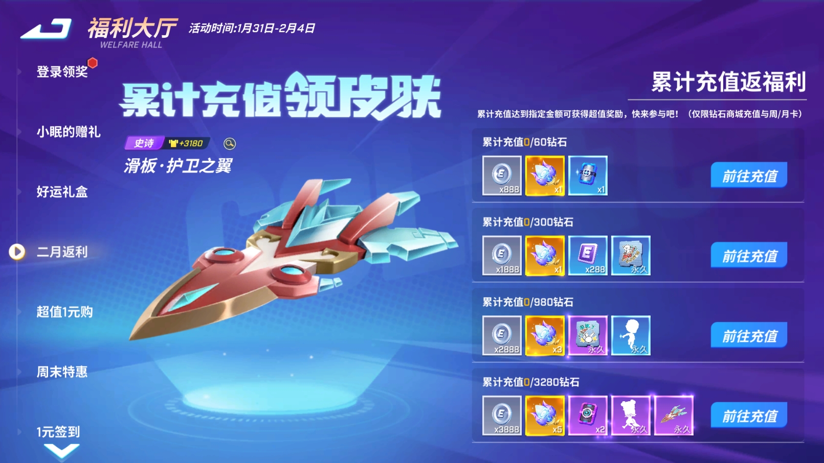 呼呼!累充来袭!新动作新涂鸦来咯~1月31日至2月4日,累计充值达一定额度可获得永久史诗道具卡皮肤【滑板·护卫之翼】!还有【玩脱了】涂鸦、【小滑板来咯】涂鸦、【雇佣兵·得瑟一下】动作、【小狐狸·动感节拍】动作、微光之种等丰富奖励等你解锁~