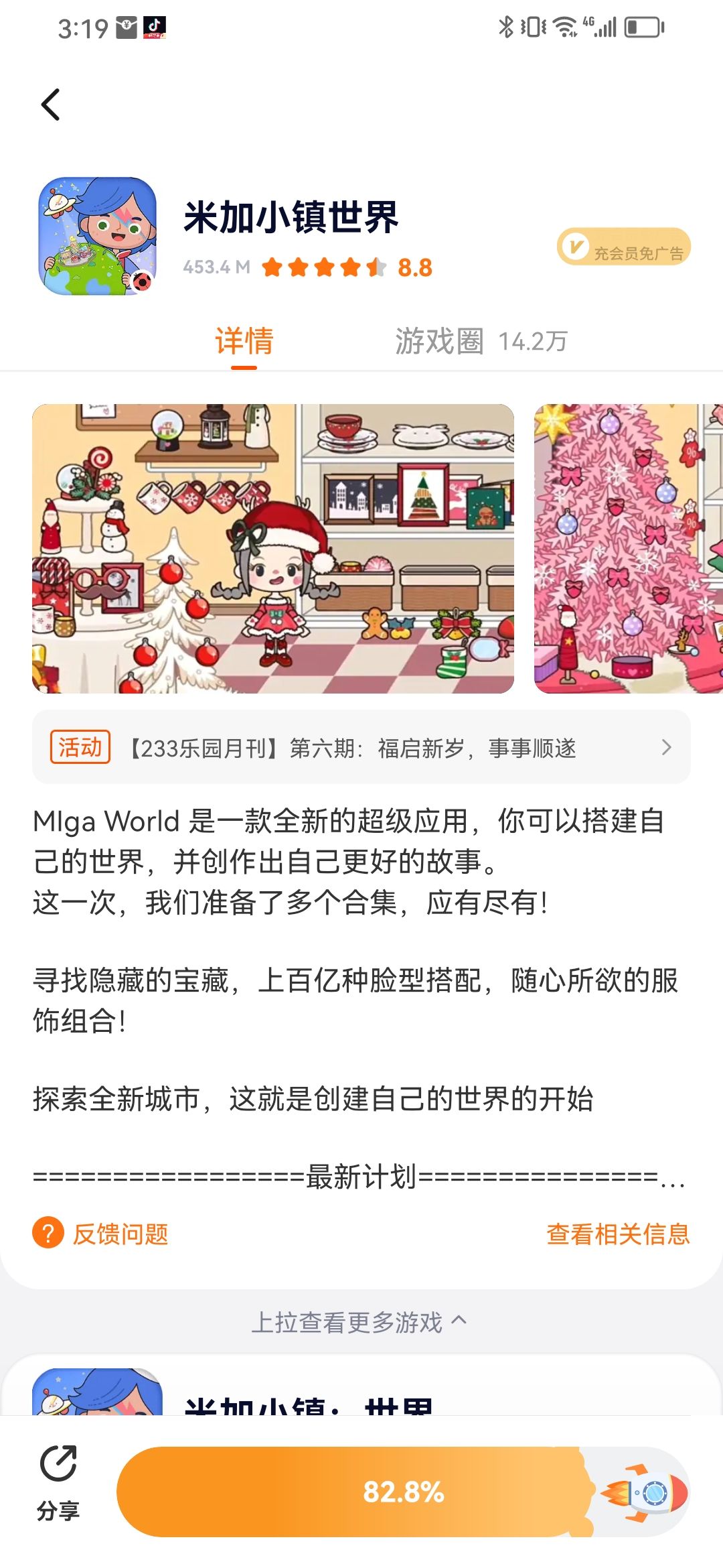 MIga World 是一款全新的超级应用,你可以搭建自己的世界,并创作出自己更好的故事。 这一次,我们准备了多个合集,应有尽有! 寻找隐藏的宝藏,上百亿种脸型搭配,随心所欲的服饰组合! 探索全新城市,这就是创建自己的世界的开始 =================最新计划================= 我们最少会推出70个地点,140个角色,150只宠物,700套衣服裤子和更多的配饰;我们会在每个月进行更新,或推出更多的地点,让你创建属于自己的世界! 完全自定义衣服,发型,神奇的妆容让你自定义出真实的自我,创作出属于你的故事! 游戏不设规则,没有分数 公寓:随时可以回到家里,邀请一大群好朋友来晚餐,或者来个patry 餐厅:Loft楼下的餐厅,隐藏的大厨师,可以料理出多种不同的食物 便利店:7*24的小商店,有着许许多多的商品,满足你日常的任何需要 工具房:整理你的空间,也可以存放你的宝贝物品! ---尽情发挥孩子们的创意 ---超过上百亿种自定义方式 ---没有时间限制和分数排行榜 欢迎与我们联系: support@xihegame.com
