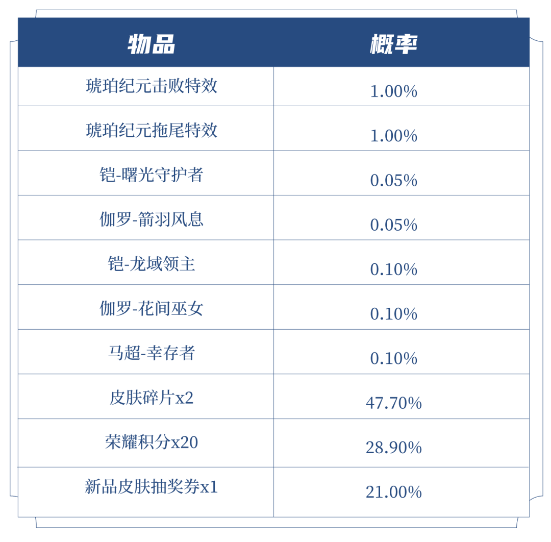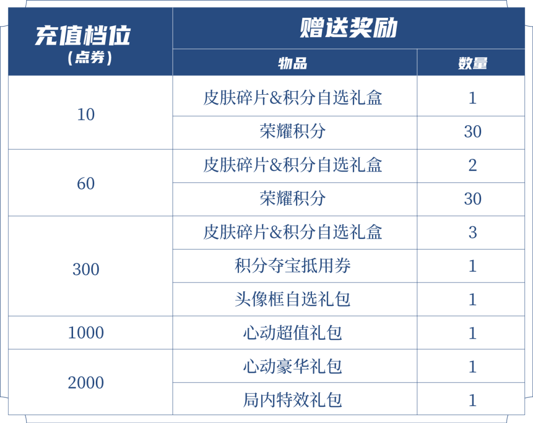♢ 皮肤碎片&积分自选礼盒:打开礼包可任意选择以下奖励之一:荣耀积分*10或皮肤碎片*1