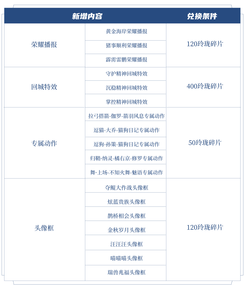 ♢ 玲珑碎片兑换新增: