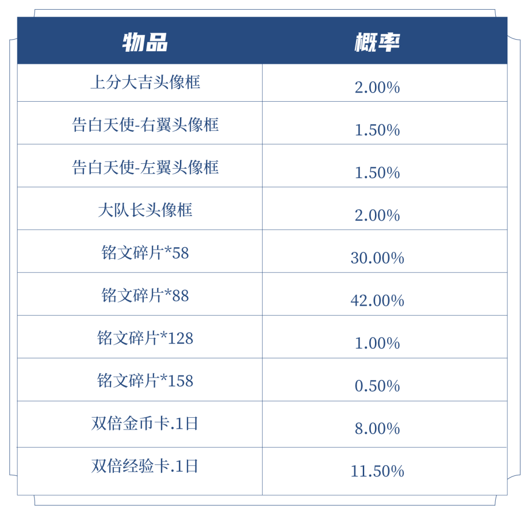 打开后可随机获得以下奖励之一:上分大吉头像框、告白天使-右翼、告白天使-左翼、大队长头像框、双倍金币卡:1日、双倍经验卡:1日、铭文碎片x158/128/88/58。