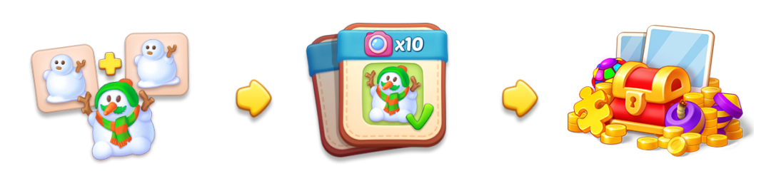 通过同类物品的两两合成,升级形态,完成左侧的收集任务,赚取活动代币,即可获得丰厚的奖励;