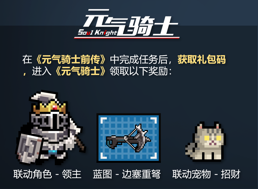 在本次联动活动中,小骑士们前往《元气骑士前传》游戏内完成任务,即可获得《元气骑士》相关奖励;前往《元气骑士》游戏内完成相关任务,则可以获得《元气骑士前传》的相关奖励!