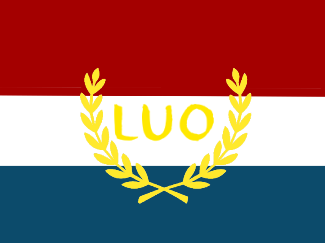 MO团国旗,红色代表神圣,白色代表洁净,蓝色代表海洋,黄色代表辉煌,树叶代表和平,字母luo代表创始人