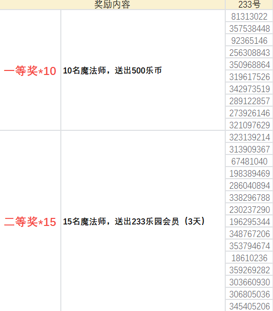 随机抽取15名魔法师,送出233乐园会员(3天)