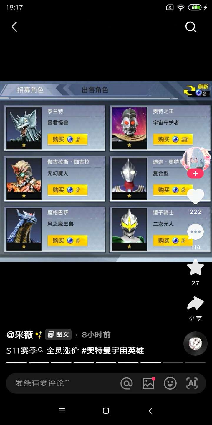 S11赛季全员涨价。有四个阵容分别是小金人、真理特利迦、奥特之王、赛迦。我不知道德凯厉不厉害