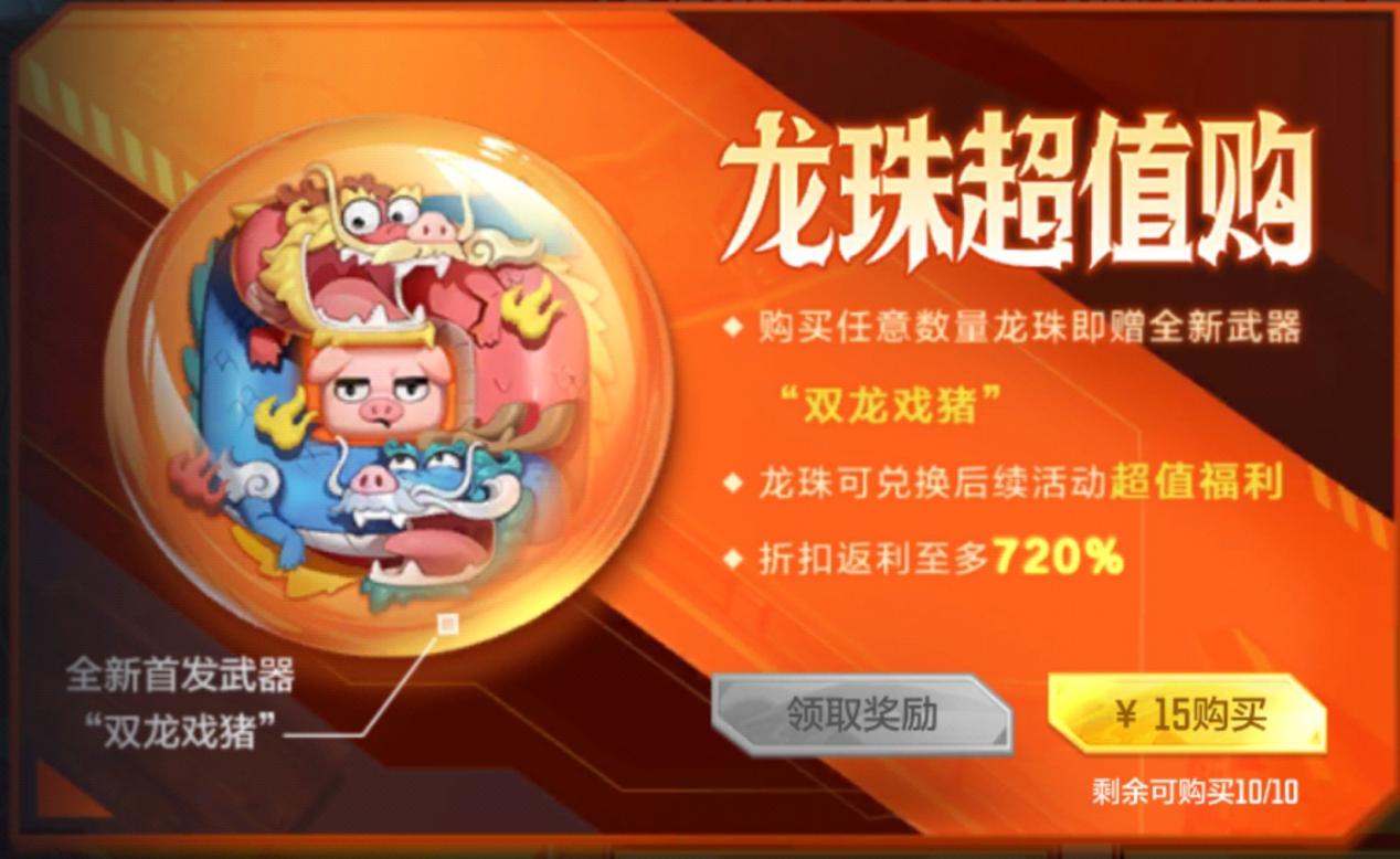 只要你完成龙卡的购买,不仅能获得全新近战武器——双龙戏猪,还可以在指定活动中使用龙珠兑换各种超值道具!而且目前正热抽奖活动基本都包含在内,抽奖币、抵用券、赏金令积分……你想要的,这里都有!