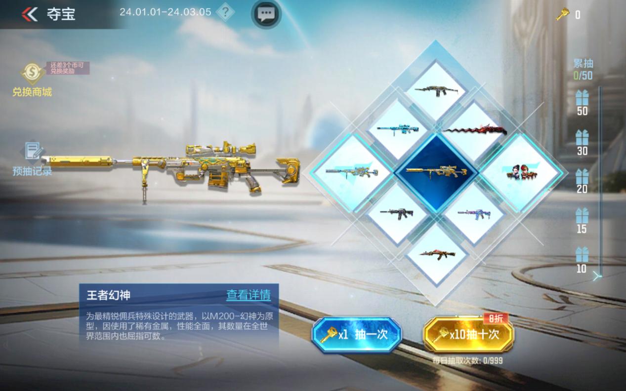 龙珠的又一大妙用来了啦!你现在可以使用龙珠兑换近战夺宝钥匙以及抵用券,在近战王者夺宝中抽取全新近战武器——雷霆王者之锋和王者之击等王者近战武器!手握雷霆王者之锋,在战场上近战肉搏,感受王者武器的霸气与威力!