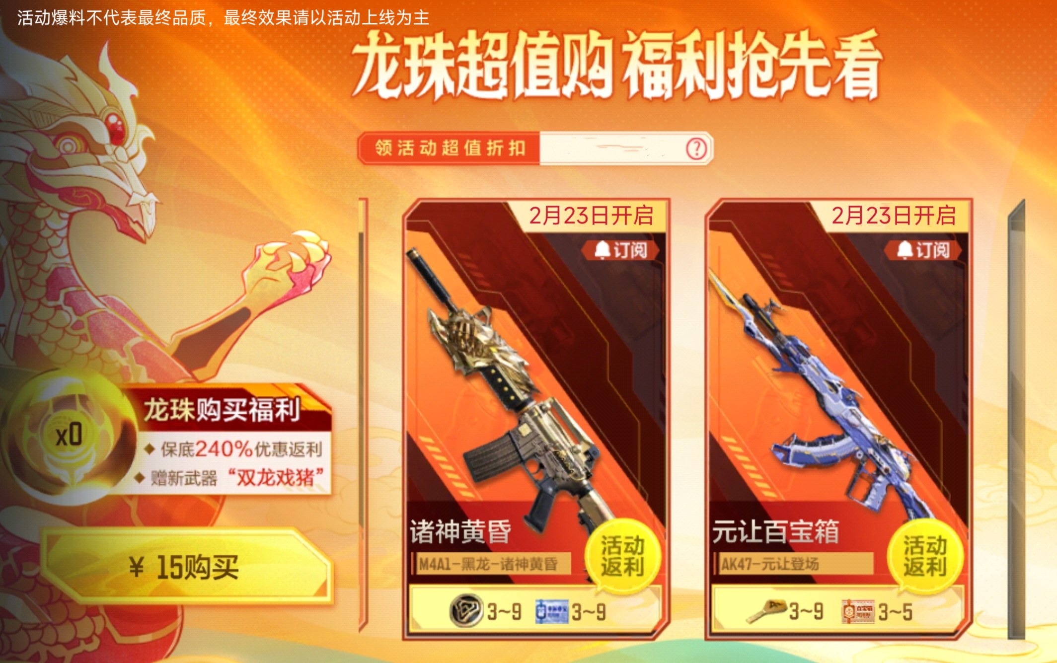 各位CFer小伙伴们,是不是已经被前面的龙卡福利震撼到了呢?别着急,还有更多重磅福利等着你!龙珠超值购福利活动后面依旧力度不减,后续的诸神黄昏夺宝和元让百宝箱将于2月23日火热开启!玩偶枪娃娃机也将在3月1日欢乐上线!