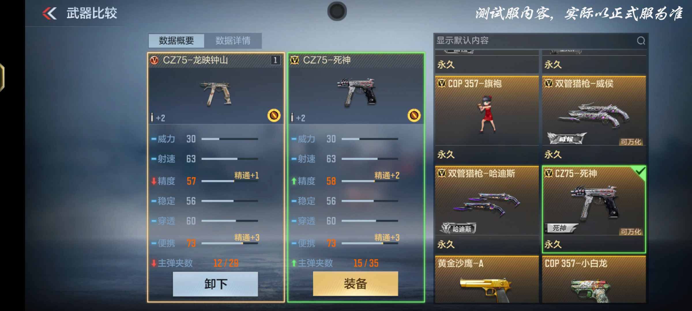 而在基础数据方面,我们可以将其与同为CZ75系列的英雄级副武器CZ75-死神进行对比。可以发现二者在威力、射速、稳定、穿透以及便携方面保持一致。而在精度以及主弹夹数上面CZ75-龙映钟山略低于CZ75-死神。不过即使是点射精度也仅仅相差一点,可以说CZ75-龙映钟山是完全不逊色CZ75-死神的存在。更何况CZ75-龙映钟山还能够进行觉醒,再加上本身身为排位武器,可以说CZ75-龙映钟山的未来期望值以及性价比非常高。