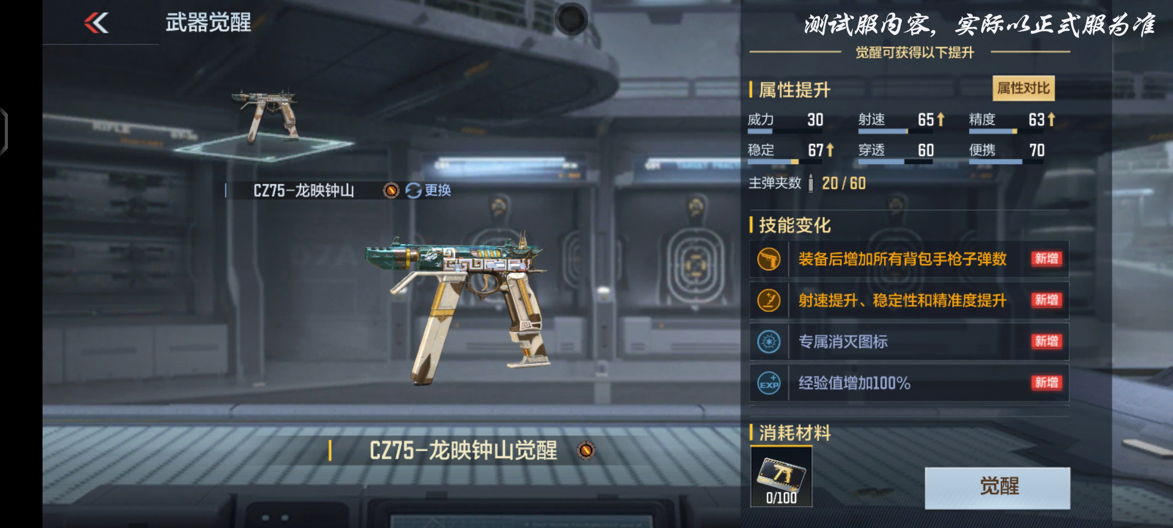 与2023年排位武器比较类似,CZ75-龙映钟山同样可以通过觉醒石进行觉醒。花费100枚觉醒石就可以变为CZ75-龙映钟山觉醒。相较于CZ75-龙映钟山,CZ75-龙映钟山觉醒不仅在属性数据方面有较大的提升,还新增了装备后增加所有背包手枪子弹数以及射速提升、稳定性和精准度提升等属性技能,有望成为与MK23系列并肩的新一代顶尖副武器。