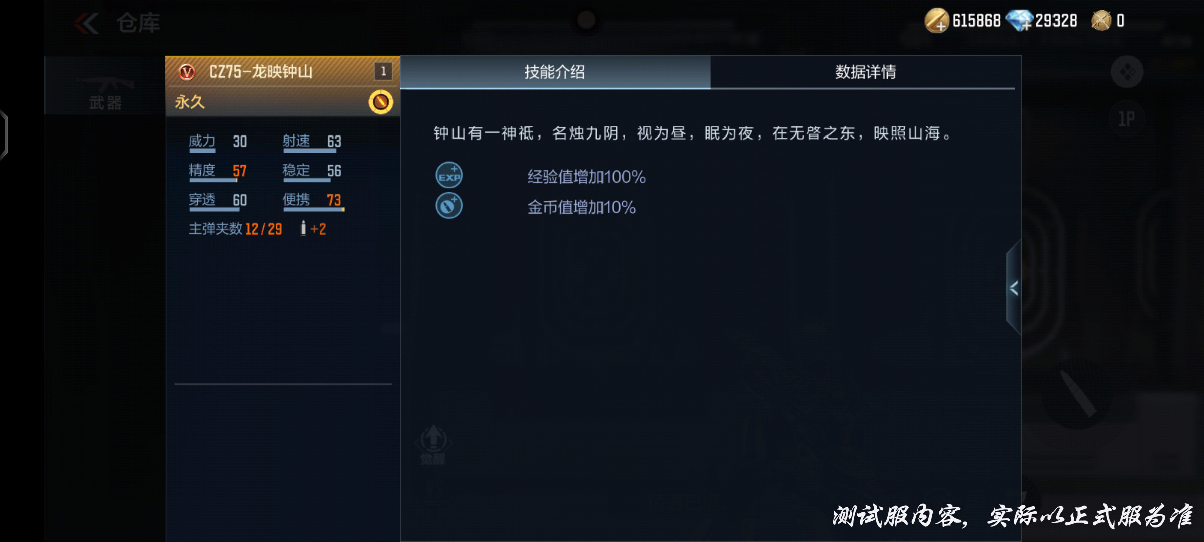 由于这款CZ75-龙映钟山是排位武器的一阶段形式,因此其仅有常规的经验值增加100%以及金币值增加10%这两项属性技能。
