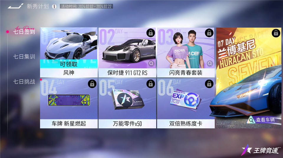 2月1日更新后,新加入速度节的车手们参与新秀计划-七日签到活动,首次登录便可免费领取风神永久赛车,累计登录2天可赢取保时捷911 GT2 RS,累计登录7天就可以将兰博基尼Huracán STO收入麾下!此外还有闪亮青春套装、新星燃起车牌、万能零件等珍贵奖励可在签到活动中免费获取!